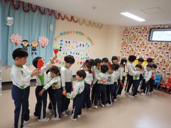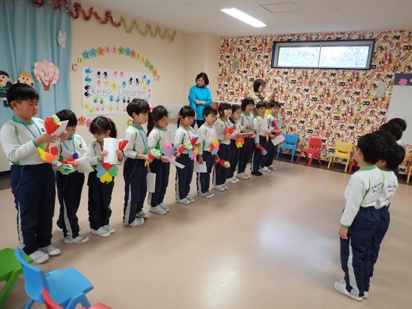 年少さんからは、紙を染めて作った花と歌のプレゼントを贈りました。