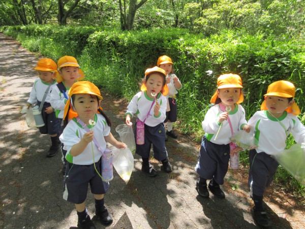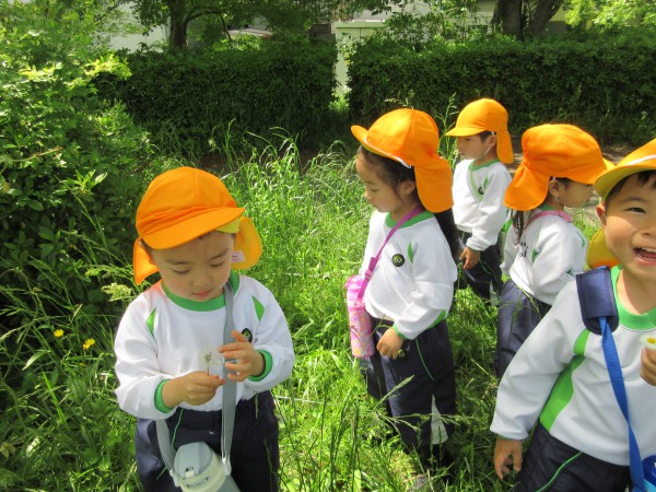 園の近くの遊歩道を歩いて、新緑の並木道を歩きました。鳥の声に耳を澄ましたり、タンポポを摘んだりしながら散歩を楽しみました。