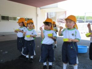 シャボン玉や水鉄砲として遊びました。大きなシャボン玉を作ろうと息をそっとふいたり、強く吹いて小さなシャボン玉をたくさん作ったりして喜んで遊んでいました。水鉄砲の使い方を覚えて、オバケの的に勢いよく水を当てることも楽しんでいました。