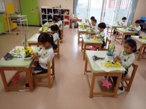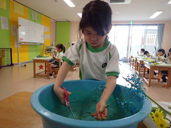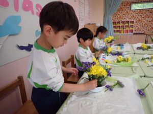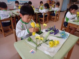 今日は4・5歳児クラスで今年度初めてのフラワーアレンジメントを行いました。今回の花言葉は「優しい心」で、メインの花は菖蒲でした。その他に黄色のチューリップやスプレーマム、紫のスターチス、緑のフェザーロッド、水色のかすみ草、そして「こどもの日」にちなんで、こいのぼりピックを使いました。こどもたちは花を切ったりアレンジをして、豪華な作品をつくることができました。4歳児や新入園児には初めてのフラワーアレンジメントということもあり、出来上がった作品を家に持ち帰るのを楽しみにしている様子でした。