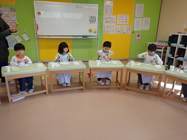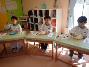今日は、テーブルマナーについて学ぶ時間がありました。ナイフとフォークを使ってステーキをいただく際のマナーや、スープを飲む際のスプーンの使い方など、様々なテーブルマナーについて知ることができました。食べ物を口に入れたまま喋ったり、横を向きながら食べたりなど、行儀の悪いことはしないということも、改めて学ぶことができました。口が汚れた際の拭き方をナプキンを使って練習したり、粘土をステーキに見立てて、実際にナイフとフォークを使う練習をしたりしました。次回は本物のステーキをいただきます。子どもたちは楽しみにしている様子でした。