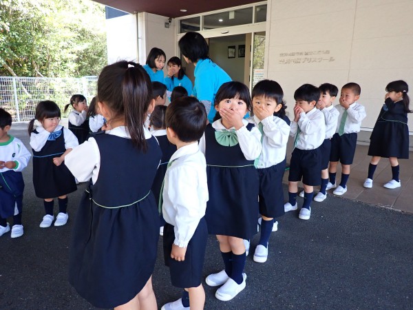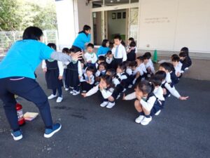 火災避難訓練を行いました。今年度初めての避難訓練ということもあり、新入園児の中には戸惑う姿もありましたが、先生の指示を聞き、手で口を覆いながら避難することができました。「おはなしも」のを約束をたしかめ、避難の際に守る大切なことを再確認しました。