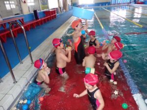 今日は、来月行われる水泳大会の練習をしました。玉入れや級別リレーをして楽しみました。みんなとても楽しそうでした。