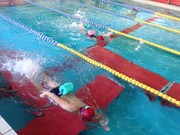 8級クラスでは、背面キックや、腕を回しながら泳ぐ練習をしました。体が沈まないように意識しながら、腕を回すことができていました。