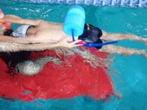 14級では、子どもたちは一人で浮く練習をしました。頭をしっかりと水につけ、良い姿勢を保って泳げるよう、繰り返し練習しました。