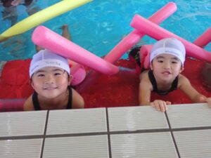 かえる級クラスでは、顔付けや浮き身の練習をしました。コーチの肩を持ち、しっかりと頭を水の中に入れて浮くことができました。バタ足も上手にできました。