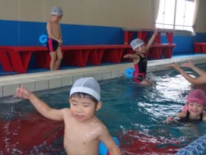 かに級クラスでは、水中歩行や顔付けをしました。2歳児クラスの子どは達は、腕にヘルパーをつけて喜んで水中歩行ができました。大きいクラスの子ども達は、コーチに励まされながら顔付けをすることができました。