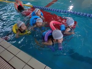 14級クラスでは、浮き身やキックの練習をしました。ビート板なしで5メートル程を泳げる子どもも増えてきました。コーチに補助してもらいながら、楽しみながら泳ぐことができました。