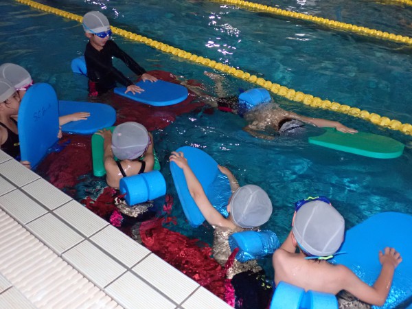14級クラスでは、浮き身やキックの練習をしました。ビート板なしで5メートル程を泳げる子どもも増えてきました。コーチに補助してもらいながら、楽しみながら泳ぐことができました。