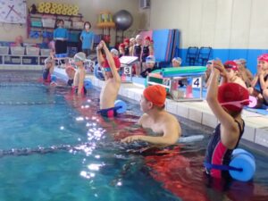 かに級、かえる級は、今までのレッスンで水に慣れ、コーチの補助を受けながら泳げるようになった様子を発表しました。