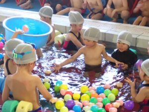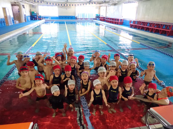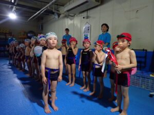 14級から10級クラスの子ども達は、それぞれの級の目標に向かって毎回意欲的に泳ぐことで、バタ足やクロールができるようになり、赤白チームで競争することができるまでになりました。