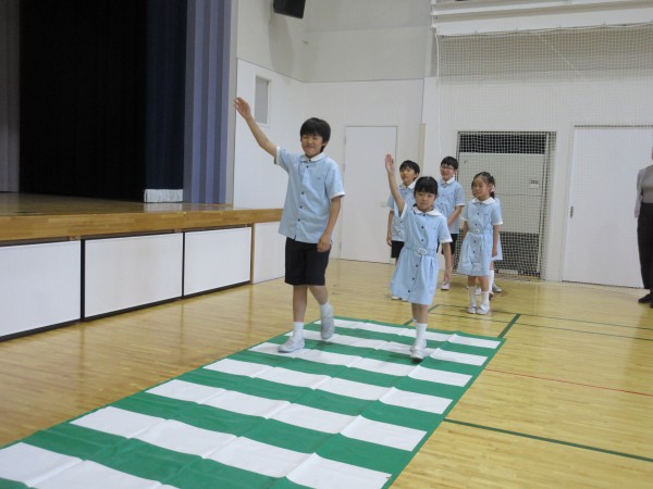 愛知警察署の指導員の方から交通安全指導を受けました。交通ルールや、自転車に乗る際には必ずヘルメットをかぶること、そして正しいヘルメットのかぶり方を教えていただいただきました。実際に横断歩道を渡る練習をして、正しく安全な渡り方も学びました。日常生活の中でも安全に過ごせるよう、今日教えていただいたことを活かしてほしいと思います。