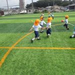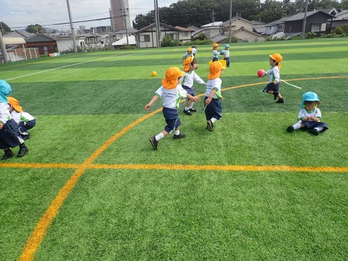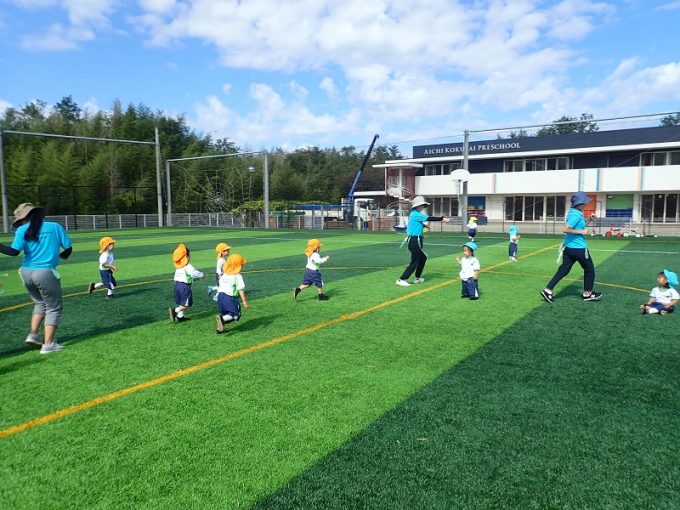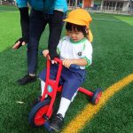 Today the kids played with tricycles at the field. The kids were taught how to pedal with their left and right foot. It was a little bit difficult for them, but somehow the kids were able to understand how tricycles work. After riding the tricycle, the kids had so much fun playing the shippo-tori (taking tails) game.