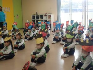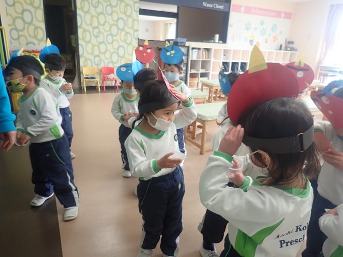 Today, we had Setsubun at the preschool. We listened to a story book about goblins. We also saw, holly and iwashi (sardines). It is said that goblins are afraid of these things. We went back to the classroom, and put on our goblin mask. And then suddenly, a scary looking goblin appeared. Some kids were very frightened, and some were crying hard. We threw lots of beans to the goblin, and finally it went away.