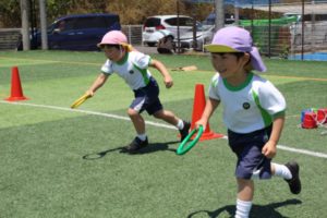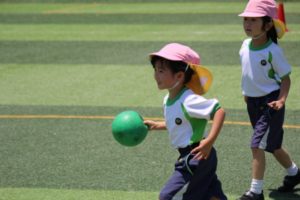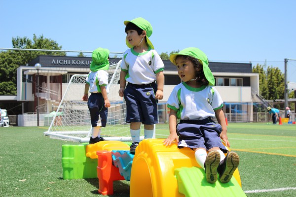 The parents observed how the children were enjoying playing outside while interacting outside at the green field. The children invited each other to play dodgeball and soccer and you can see how much they were having fun. They also joined their friends to play at the horizontal bar, plastic balance beam, and other places they liked.