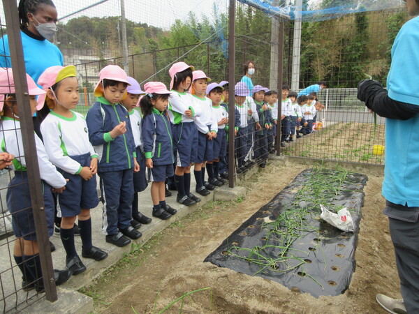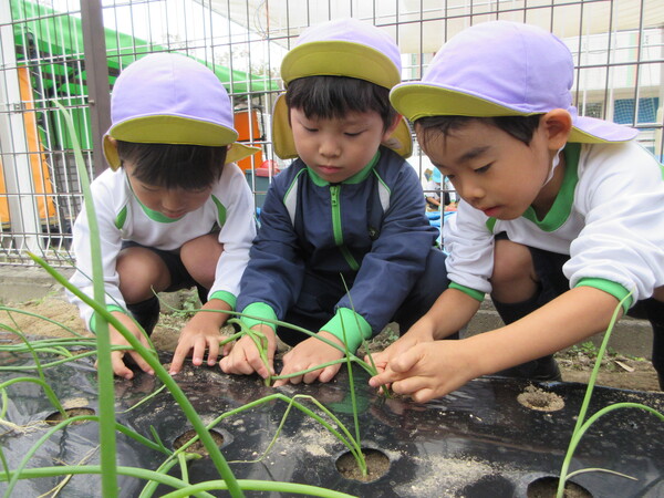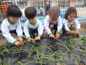 We planted onions. When teacher explained to children which part of the stem would grow into onions, they were surprised and said, “We know that.” They were happy to plant onions in the ground.