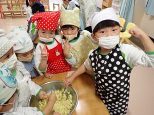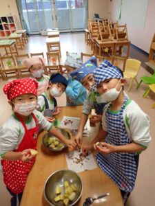 Today, we made mashed sweet potato using the sweet potatoes we planted. First, we peeled the sweet potatoes and put them in a bowl. Next, we mashed the sweet potatoes with a fork, and finally wrapped them in plastic wrap to finish. We wrapped as much as we could eat and enjoyed it.