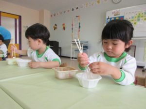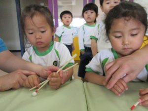 Today Sea turtle class kids learned how to hold chopsticks. Using a clay and a box shaped soccer goal net, they learned how to move the chopsticks. After practicing with the teacher, they tried to pick up tiny clay balls with chopsticks. They had fun while learning how to use chopsticks.