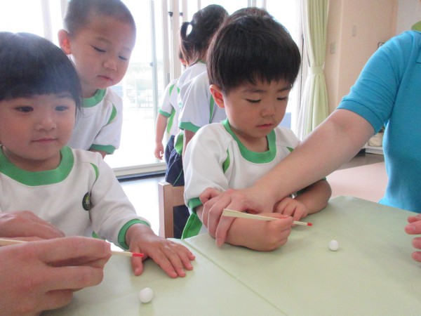 Today Sea turtle class kids learned how to hold chopsticks. Using a clay and a box shaped soccer goal net, they learned how to move the chopsticks. After practicing with the teacher, they tried to pick up tiny clay balls with chopsticks. They had fun while learning how to use chopsticks.