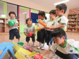 Today they played with handmade fruit and vegetable toys. Before start the game they practiced to read their shopping cards with the teacher. After practicing, the class divided in to two groups and they did a shopping race. They did a great job by reading names of the fruit and vegetable.