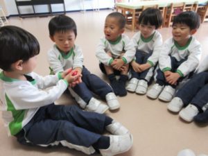 After talking about autumn fruit they played a game. They sat down making a circle and teacher gave them an apple. They had to pass the apple around the circle to the song. When the song stopped, the kid who has the apple could eat it. Everyone wanted to eat the apple and they had lot of fun.