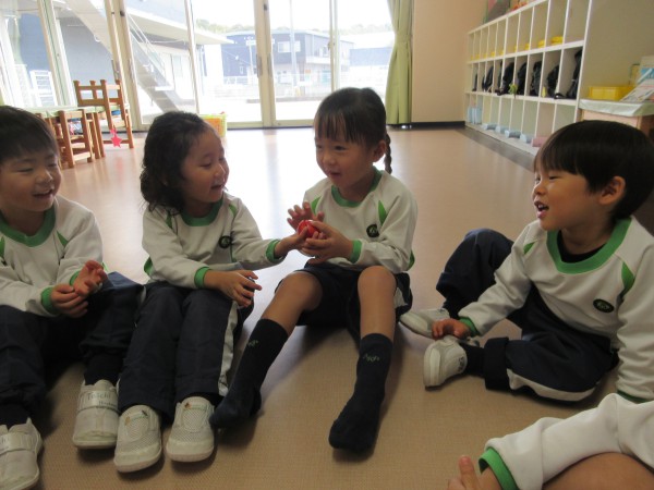 After talking about autumn fruit they played a game. They sat down making a circle and teacher gave them an apple. They had to pass the apple around the circle to the song. When the song stopped, the kid who has the apple could eat it. Everyone wanted to eat the apple and they had lot of fun.