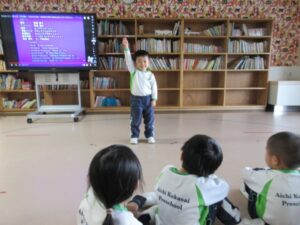 Today we watched [Momotarou] story on big screen to become familiar with the story. After watching the story, kids acted and said the lines of Peach boy. There were lot of kids who did their part with confidence. Well done kids!