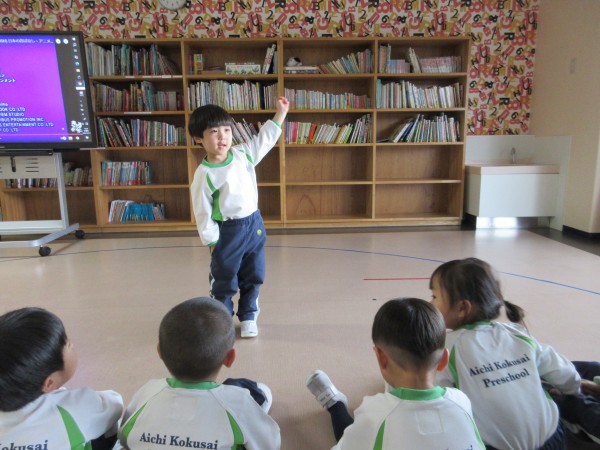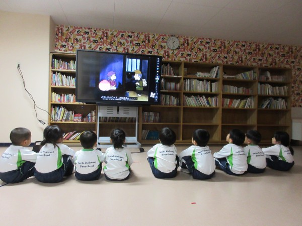 Today we watched [Momotarou] story on big screen to become familiar with the story. After watching the story, kids acted and said the lines of Peach boy. There were lot of kids who did their part with confidence. Well done kids!