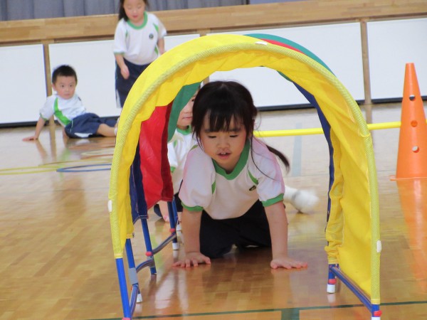 The children enjoyed an obstacle course that combined hoop jumps, tunnels, and curtain pushes. They were divided into red and white teams and enjoyed competing.