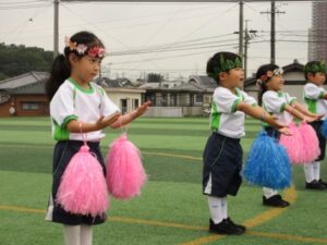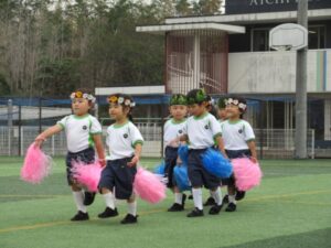The three-year-olds practiced dance, cheer competitions, marching, and more. They watched older classes cheer for their teams, learned how to cheer along, and imitated the marching style, raising their arms and legs high in the air. They practiced with enthusiasm, looking forward to the sports day.