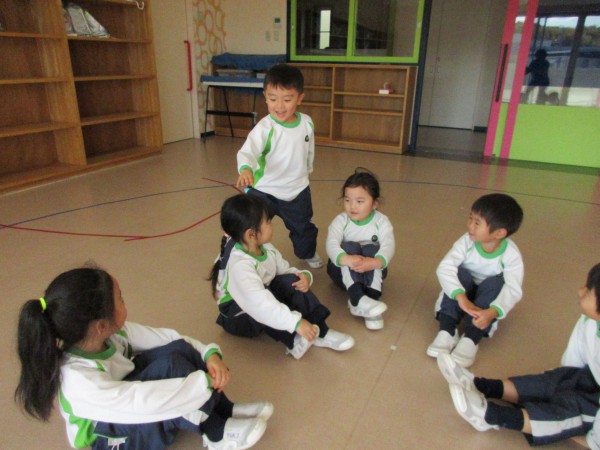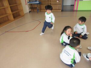 We played Duck-Duck-Goose, a game with the same rules as Handkerchief Drop. The children quickly learned the rules and enjoyed the game, touching the Oni and being touched by them.