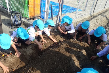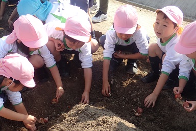 Today, Dolphin and Whale class planted “tulips” at the backyard. We started from putting the tulip bulb on the ground and covering it with the soil. We are expecting it to bloom on spring next year. Tulips signifies a “perfect love.”