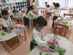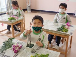 The flower of the month is rapeseed and it means to be cheerful. In today’s flower arrangement, Dolphin and Whale class used pink stick-like peach flower, yellow rapeseed, pink sweet pea, purple orchid, and green leather fan. The students showed lots of interest with the flowers and its name. They all had fun arranging the flowers and looking forward to do the next flower arrangement.
