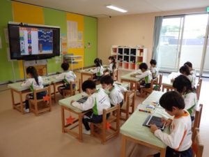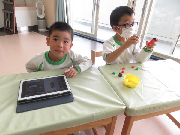 In today’s blocks programming children where challenged with “Shiren no Umi”. Children had to reach their goal (cave) whiles avoiding been hit by the sharks in the sea. Children programmed blocks using the repeat blocks and also introduced the wait block. The wait block helped Sovigo doll to pass and avoid been hit or eaten by the shark. Children learned that if they use the repeat block, even if the number of sharks increases to five or more they could reach their goal just by repeating the same movement. Children felt accomplished when they reached their goal today when using the app on their tablets.