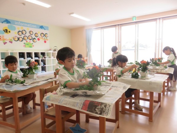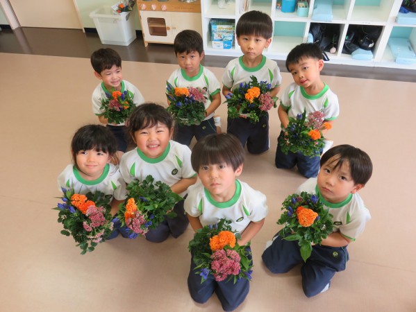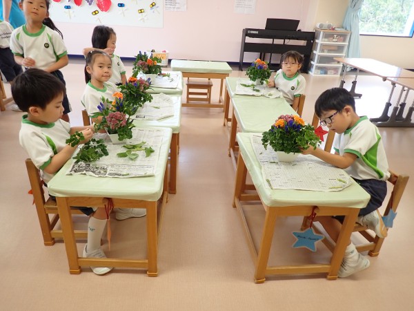 9月の花言葉は「誠実」「正義」「個性」です。メインの花は紫のリンドウ、オレンジのケイトウ、ピンクのセダムで、ポリシャスという緑の葉っぱを生けました。子どもたちはきれいに気持ちをこめてアレンジメントしました。積極的に活動に参加でき、次のフラワーアレンジメントも楽しみにしている様子でした。