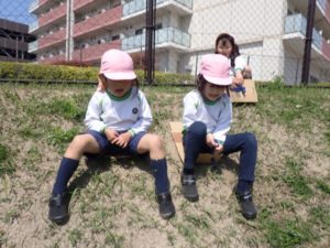 They followed the traffic rules and walked to a little faraway park. At the park, the children enjoyed playing in their favorite spots, such as sledding on the grass and sliding down the big slide. On the way back to school, we passed through a row of cherry blossom trees and enjoyed the cherry blossoms in full bloom.