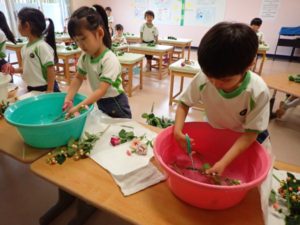 This month’s main flower is the Dianthus Caryophyllus, also known as Carnation. The flower signifies “innocence and loveliness.” Dianthus is characterized by small pink flowers that cluster together to form a single bloom. Red flowers represent roses, large pink flowers denote Gerbera, small pink flowers are Spray Carnations, and those with small bodies are Hypericum. The green leaves belong to Dracena. The arrangement is made cute and charming by curling Dracena leaves and securing them with a stapler.