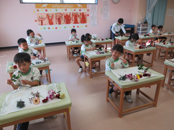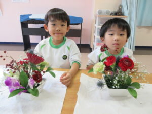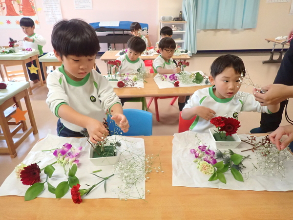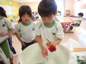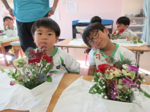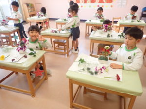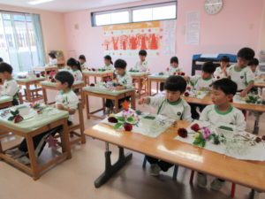 Today’s main flower was Sankirai. Other flowers included carnation, gerbera, orchid, baby’s breath, ruscus, and eryngium. Children excitedly cut and arranged the flowers beautifully in their flower pots.