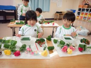 The main flower for December was Rose. The theme was Beauty and Love. We also used gerbera, carnation, hypericum, dracaena and some Christmas ornaments which made the flowers stood out today. Children cut and arranged the flowers with much love and care. They expressed a lot of thoughts such as colorful, pretty, cool, and more about the flowers they arranged.