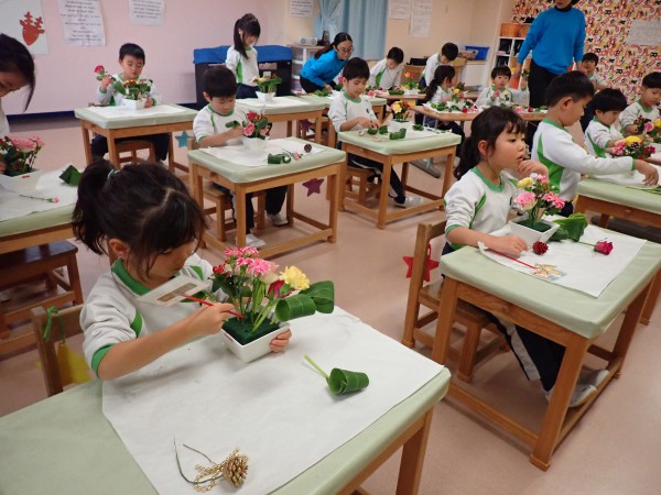 The main flower for December was Rose. The theme was Beauty and Love. We also used gerbera, carnation, hypericum, dracaena and some Christmas ornaments which made the flowers stood out today. Children cut and arranged the flowers with much love and care. They expressed a lot of thoughts such as colorful, pretty, cool, and more about the flowers they arranged.