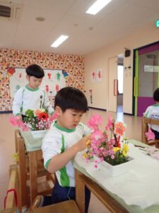 This month we used flower peach as our main flower for flower arrangement. The theme was charming, good-natured and invincible. We also used other flowers like nano, gerbera, chrysanthemum, sweet pea and baby’s breath. We decorated our flower pots with hinamatsuri pick too. Everyone enjoyed arranging their flowers in the pot and described it as pretty, colorful and cool.