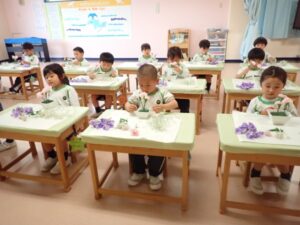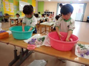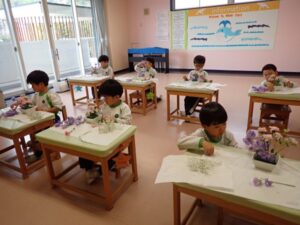 Today the 4 and 5 year olds did their first flower arrangement for the school year. The flower theme was “Kind Heart”. The main flower was “Sakurakomachi”. We used baby’s breath, purple sweet pea, and pink spray carnation as well. Children cut, sorted, and arranged the flowers beautifully in their flower pots. Since it was the first time for the 4 year olds they were very excited and also grateful.