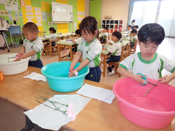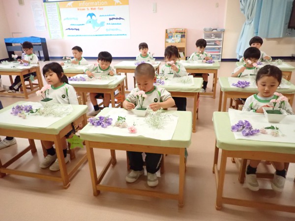 Today the 4 and 5 year olds did their first flower arrangement for the school year. The flower theme was “Kind Heart”. The main flower was “Sakurakomachi”. We used baby’s breath, purple sweet pea, and pink spray carnation as well. Children cut, sorted, and arranged the flowers beautifully in their flower pots. Since it was the first time for the 4 year olds they were very excited and also grateful.
