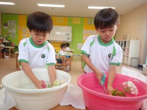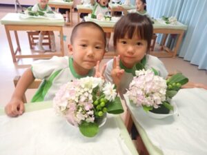 It is a rainy season and Hydrangea was carefully chosen as the main flower for June. The theme for the flower was “Family and Harmony”. When children saw the flowers they were excited and filled with joy. We also used gerbera, rose, carnation (all white), hypericum, and dracaena to complement the hydrangea. Children cut and arranged the flowers beautifully into their flower pots with joy.
