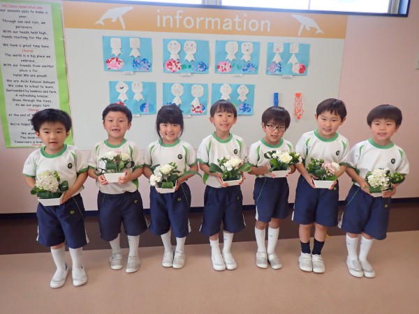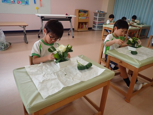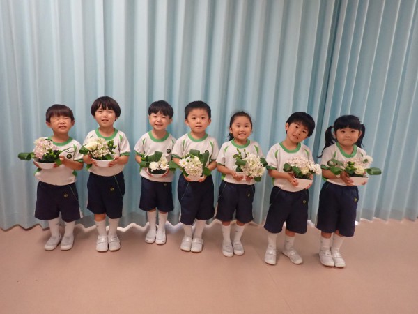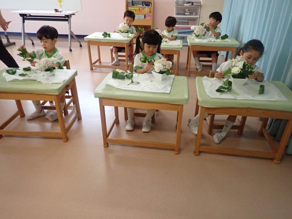 It is a rainy season and Hydrangea was carefully chosen as the main flower for June. The theme for the flower was “Family and Harmony”. When children saw the flowers they were excited and filled with joy. We also used gerbera, rose, carnation (all white), hypericum, and dracaena to complement the hydrangea. Children cut and arranged the flowers beautifully into their flower pots with joy.