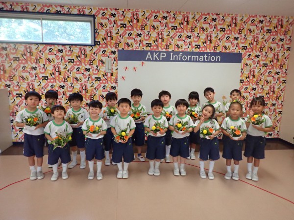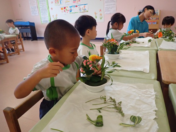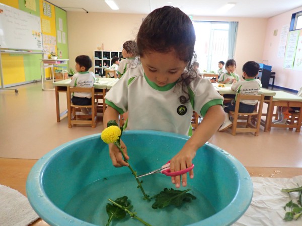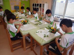 Today’s flower arrangement theme was I Love You. We used yellow chrysanthemum, orange gerbera, light pink fujibakama (Eupatorium), pink hypericum, and dracaena. Children cut the flowers with lots of care and arranged them beautifully around the main flower, chrysanthemum to make it stand out. They had fun trying to create different names for the flowers and are also excited to present them to their parents.