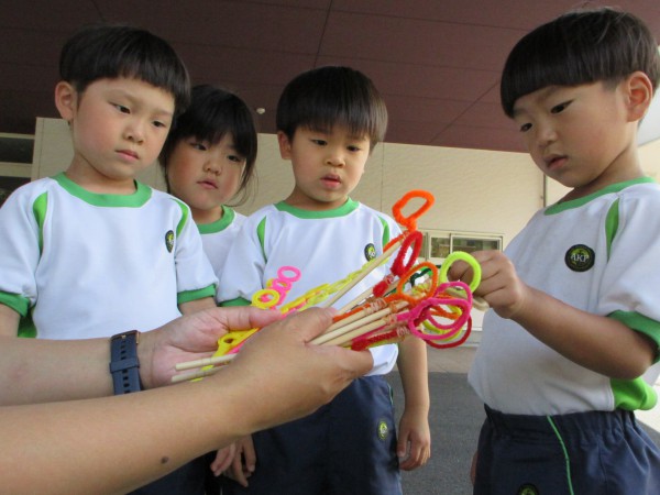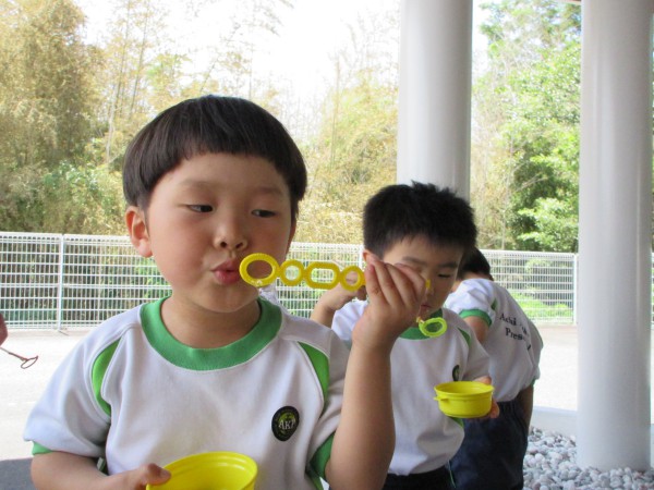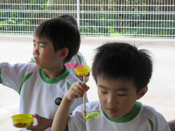 The children played with the bubbles. They were so happy to blow slowly and make big bubble soap. Some children competed with their friends to see who could blow the most bubbles.