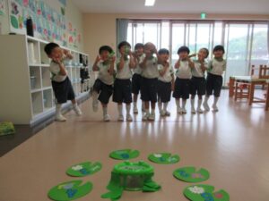 Today the 4 year old class enjoyed playing frog toss together with their friends. Everyone tried their best to toss the frog towards the lily pods to get a score for their team. They all aimed to toss their frogs to the lily pod with high scores. The kids are looking forward to the next game we will play.