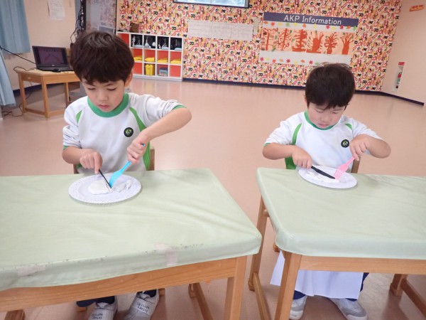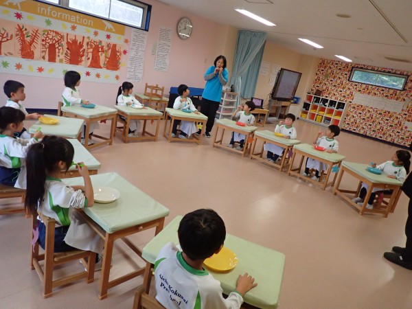 We learned from a video that dining manners differ from country to country. In the practical session that followed, we practiced how to hold and cut using knives, forks, and spoons. We made something that looked like a hamburger steak out of clay and practiced cutting it little by little from one end and pretended to eat. Interestingly, we learned about things to be careful of while eating, how to place the spoon and fork during and after the meal. Since this was the second time, children have improved a lot on using forks and knives. They hope to use cutlery in the future for meals.