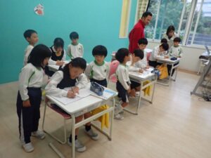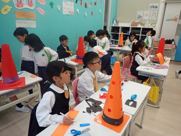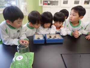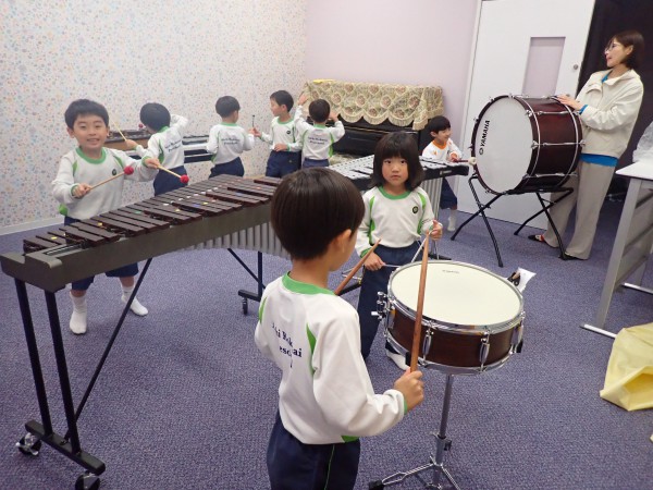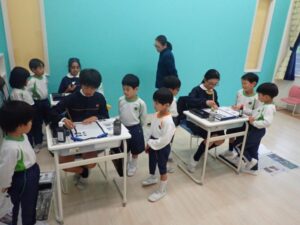 Today the 5 year olds went to the elementary school. They observed lessons at all grades. They observed an art class in first and second grade, social studies in third grade, science in fourth grade, science experiment in fifth grade, and Japanese lesson in the sixth grade. Children showed a lot of interest in the all the lessons especially the calligraphy. They learned about ‘bokujou’ the black paint for writing calligraphy. Children usually use water instead of the special paint. We ended our visit at the music room where children interacted with all the musical instruments. They learned the names of the various musical instruments and had lots of fun playing freely with them. Children are excited to perform songs with the musical instruments during academic presentation.